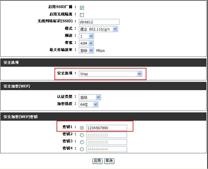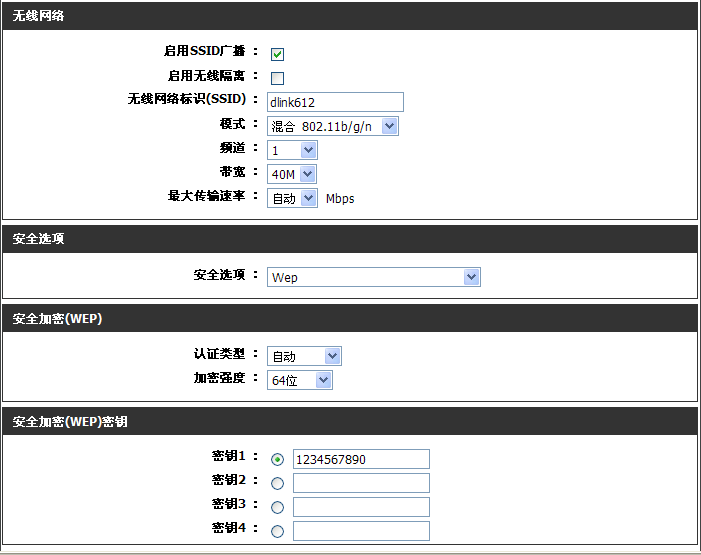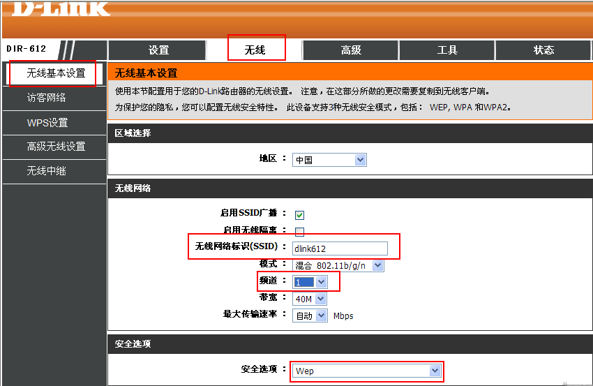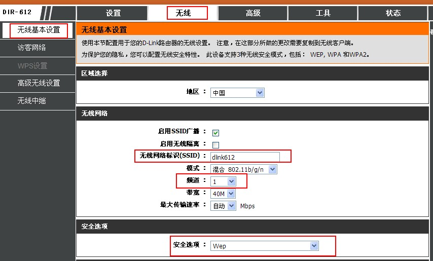 2、設置主的DIR-612-A的無線參數(shù),如圖: